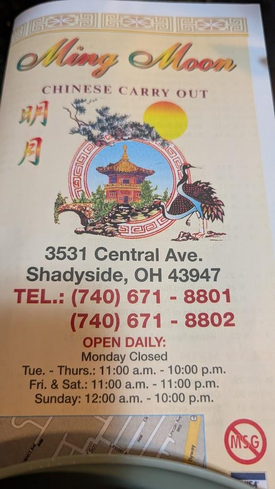 Ming Moon stands out as a family-run Chinese restaurant that has earned loyal following in Shadyside, Ohio. Located near bustling Central Avenue, we focus on classic American-Chinese favorites made fresh daily without the use of MSG. Our chefs craft dishes using high-quality ingredients, delighting customers with favorites such as sweet and sour chicken, General Tso's chicken, and fried rice with perfect flavor balance.